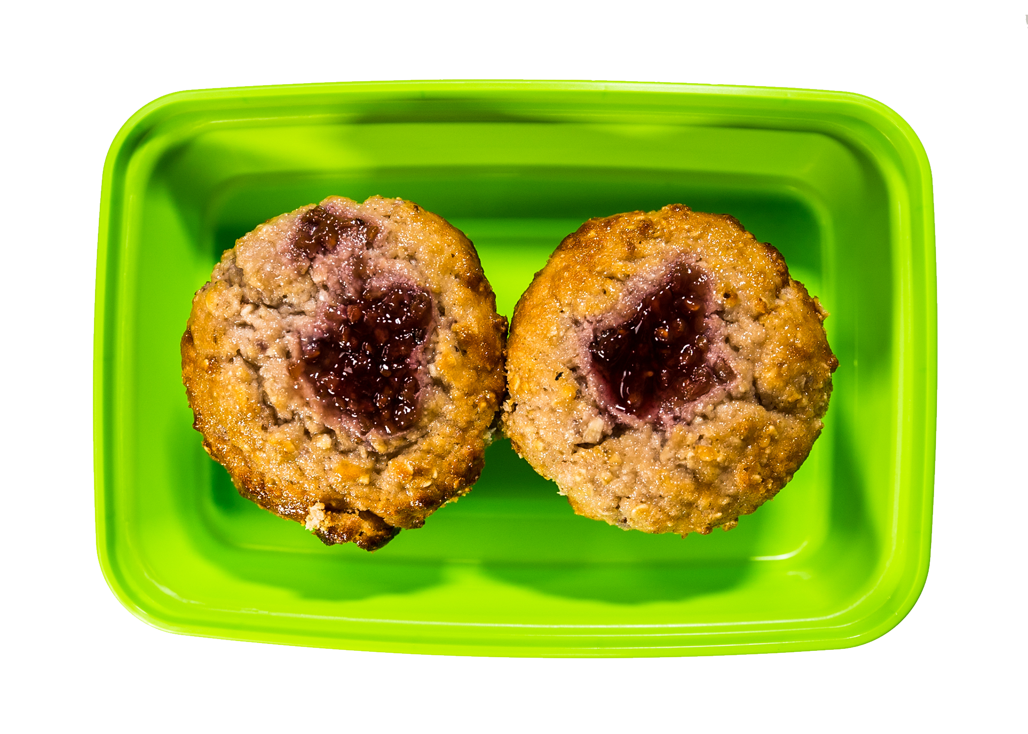 Two fluffy protein-based muffins. Raspberry jam on top to add a refreshing flavor.