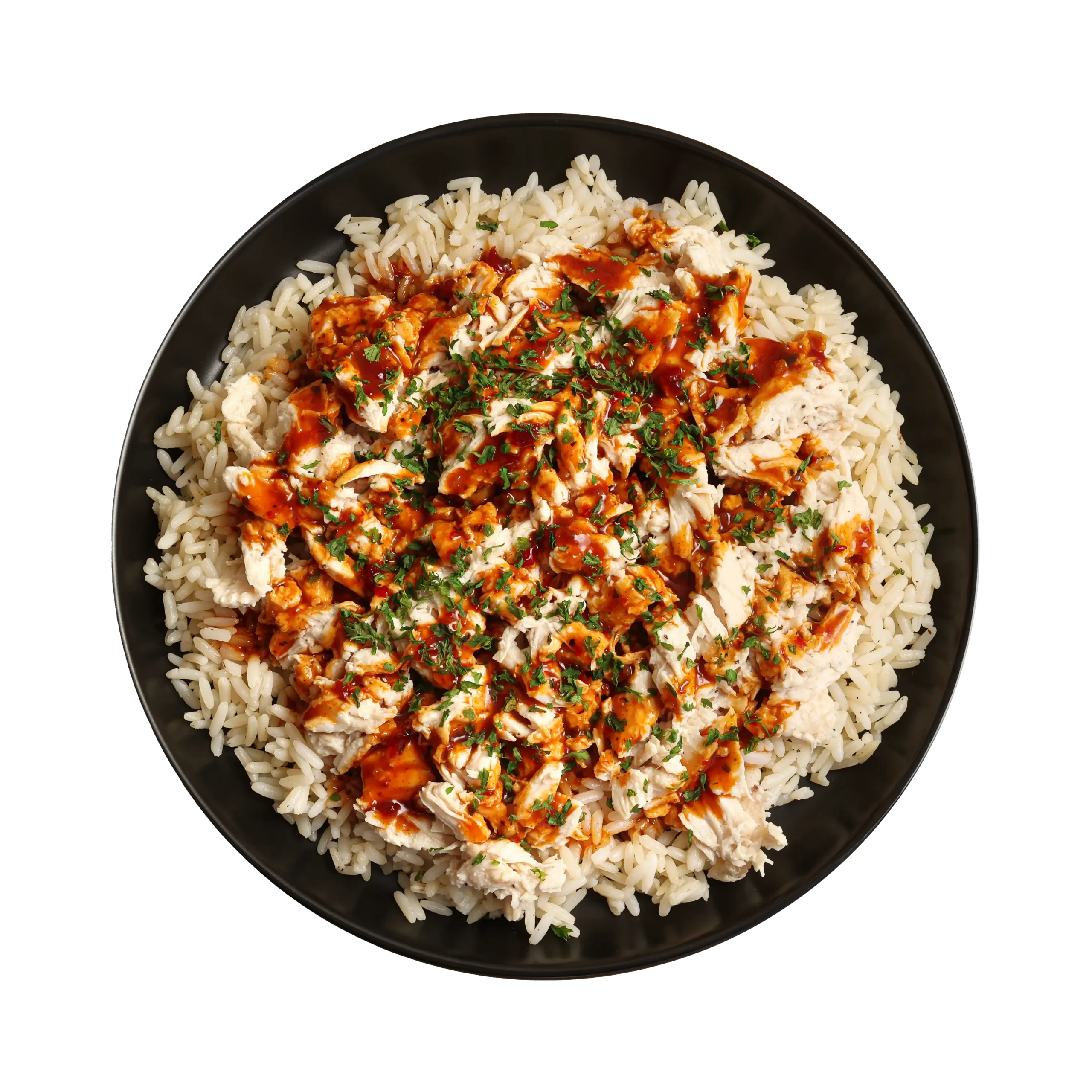 Chicken, rice (enriched long grain parboiled rice, iron [ferric orthophosphate], niacin, thiamine [thiamine mononitrate], and folic acid), BBQ sauce (distilled vinegar, tomato paste, modified corn starch, salt, pineapple juice concentrate, natural smoke flavor, spice, caramel color, molasses, sodium benzoate, garlic, mustard flour, corn syrup, sugar, tamarind, natural flavor, celery seed), olive oil, white wine vinegar, white cooking wine, pepper, and salt.
