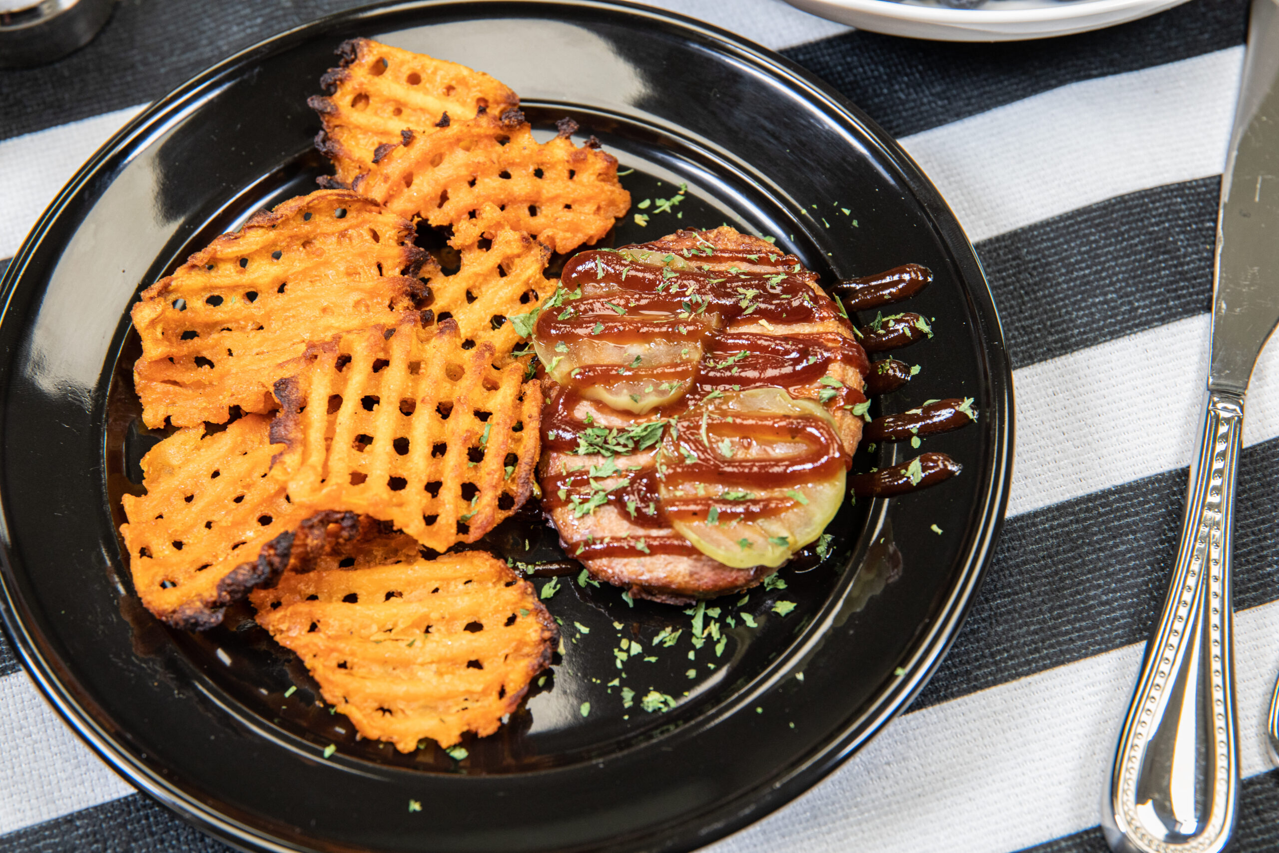Turkey burger (turkey dark meat, maltodextrin, salt, modified food starch, natural and artificial cheese flavor, natural flavorings [contains natural smoke flavor], autolyzed yeast, natural flavoring), sweet potato waffle fries (sweet potatoes, vegetable oil [oleic canola, canola, sunflower], enriched wheat flour [flour, niacin, iron, thiamine mononitrate, riboflavin, folic acid], sugar, corn starch, modified corn starch, leavening [disodium dihydrogen pyrophosphate, sodium bicarbonate], salt, dextrin, natural flavor, guar gum), BBQ sauce (high-fructose corn syrup, distilled vinegar, tomato paste, modified corn starch, salt, pineapple juice concentrate, natural smoke flavor, spice, caramel color, molasses, sodium benzoate, garlic, mustard flour, corn syrup, sugar, tamarind, natural flavor, celery seed), pickles (water, fresh cucumbers, salt, vinegar, calcium chloride, sodium benzoate, spices [contains mustard], natural flavor, polysorbate 80, dehydrated red peppers, turmeric extract), olive oil, parsley, and black pepper.