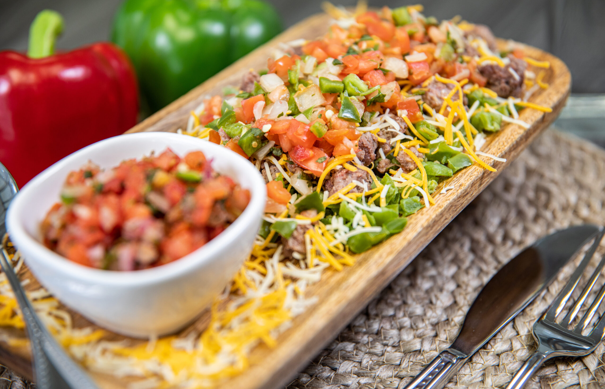 Lean ground beef, diced peppers, cheddar, Monterey Jack (cheddar cheese [pasteurized milk, cheese cultures, salt, enzymes, annatto vegetable color]), pico de gallo (tomatoes, onions, green pepper, jalapeño pepper, red pepper, cilantro, green onion, red wine vinegar, salt, pepper), olive oil, white cooking wine, fajita seasoning, taco seasoning, garlic salt, pepper, and salt.