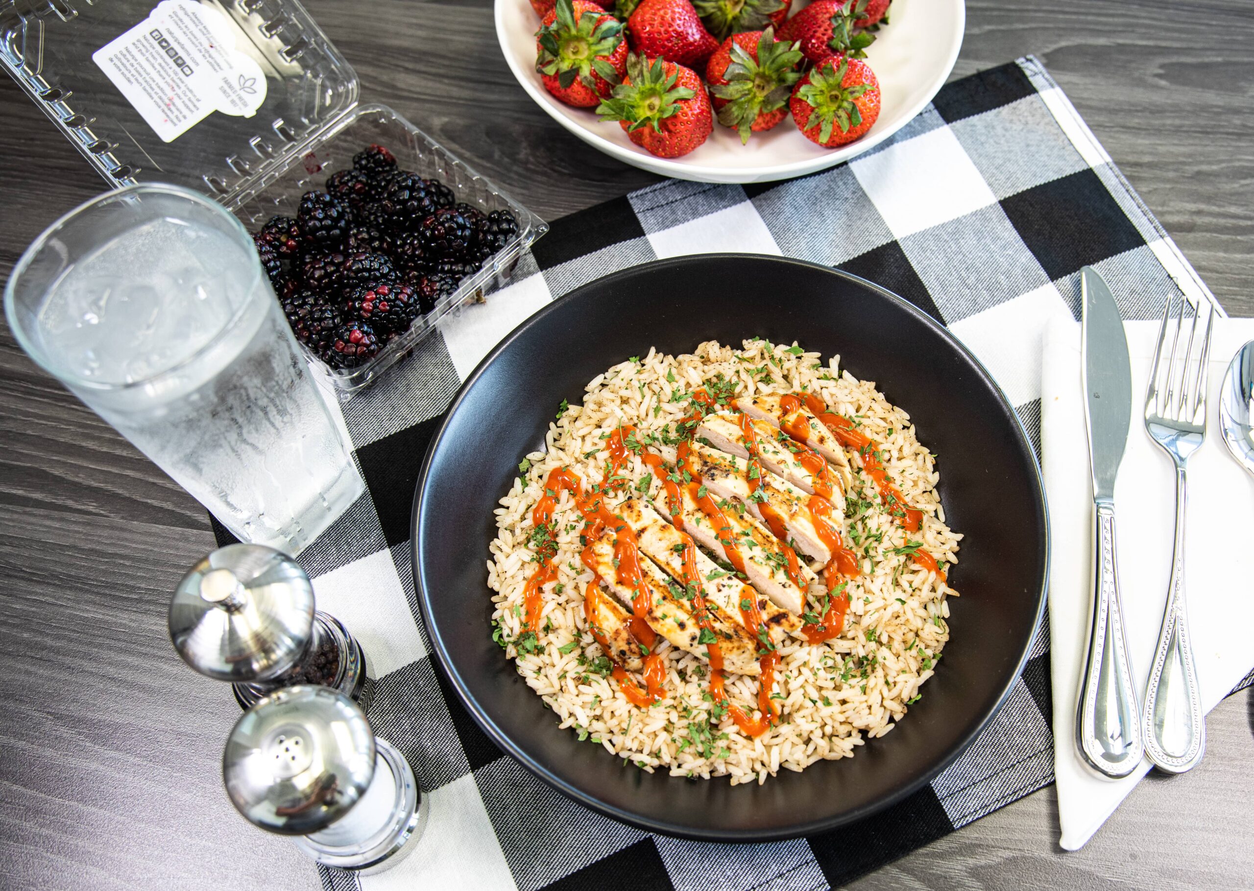 Chicken, rice (enriched long grain parboiled rice, iron [ferric orthophosphate], niacin, thiamine [thiamine mononitrate], folic acid), buffalo sauce (distilled vinegar, aged cayenne red peppers, salt, water, modified corn starch, canola oil, paprika, xanthan gum, carrot fiber, garlic powder, natural flavor), olive oil, white wine vinegar, white cooking wine, pepper, and salt.