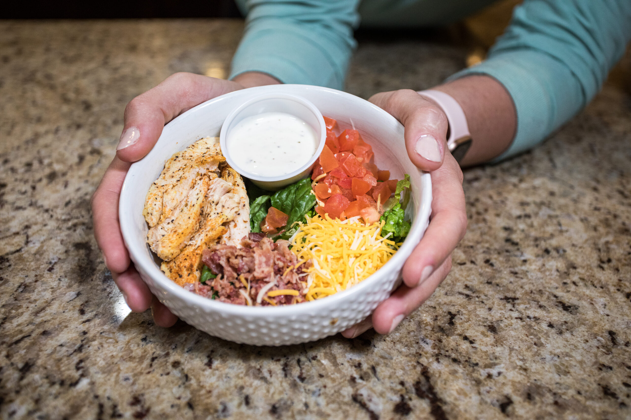 Chicken, bacon, shredded carrots, cheddar cheese, Monterey Jack cheese (pasteurized milk, cheese cultures, salt, and enzymes), corn starch (anti-caking agent), jalapeño ranch (soybean oil, cultured low-fat buttermilk, water, green jalapeño pepper, egg yolks, distilled vinegar, salt, high fructose corn syrup, green jalapeño pepper*, modified food starch, onion*, buttermilk, sodium benzoate and potassium sorbate, calcium disodium EDTA [to protect flavor], monosodium glutamate, polysorbate 60, xanthan gum, garlic*, torula yeast, spices, hydrolyzed soy protein, propylene glycol alginate, mustard seed, citric acid, acetic acid, and lactic acid), romaine lettuce (lettuce, carrots), olive oil, white wine vinegar, white cooking wine, Cajun seasoning, lemon pepper seasoning, salt, and pepper.