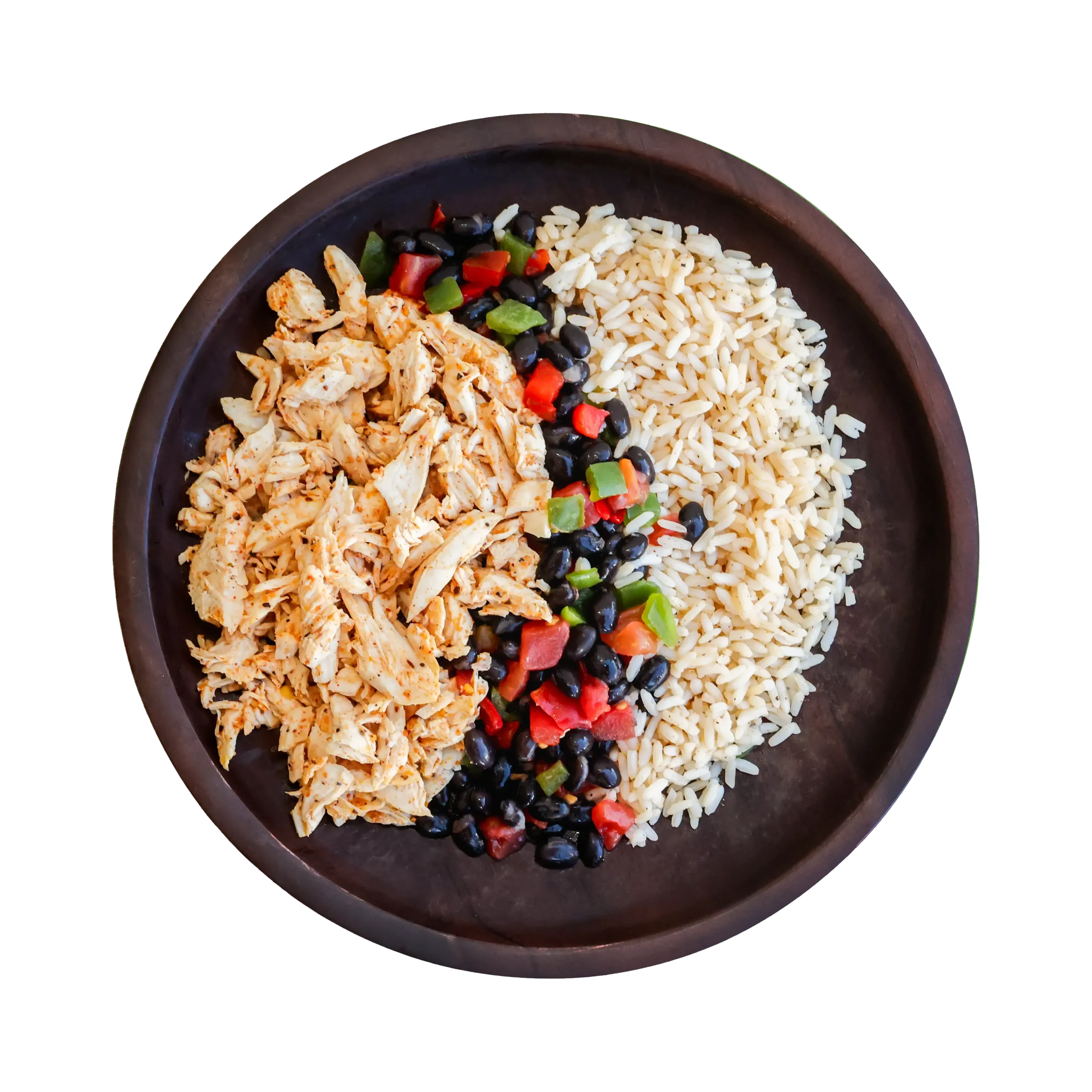 Chicken, rice (enriched long grain parboiled rice, iron [ferric orthophosphate], niacin, thiamine [thiamine mononitrate], folic acid), black beans (black beans, water, sugar, salt, calcium chloride [firming agent]), green peppers, Rotel (tomatoes, water, chopped green chili peppers, salt, calcium chloride, natural flavor, citric acid, cilantro), olive oil, white wine, white wine vinegar, taco seasoning, garlic salt, black pepper, and salt.