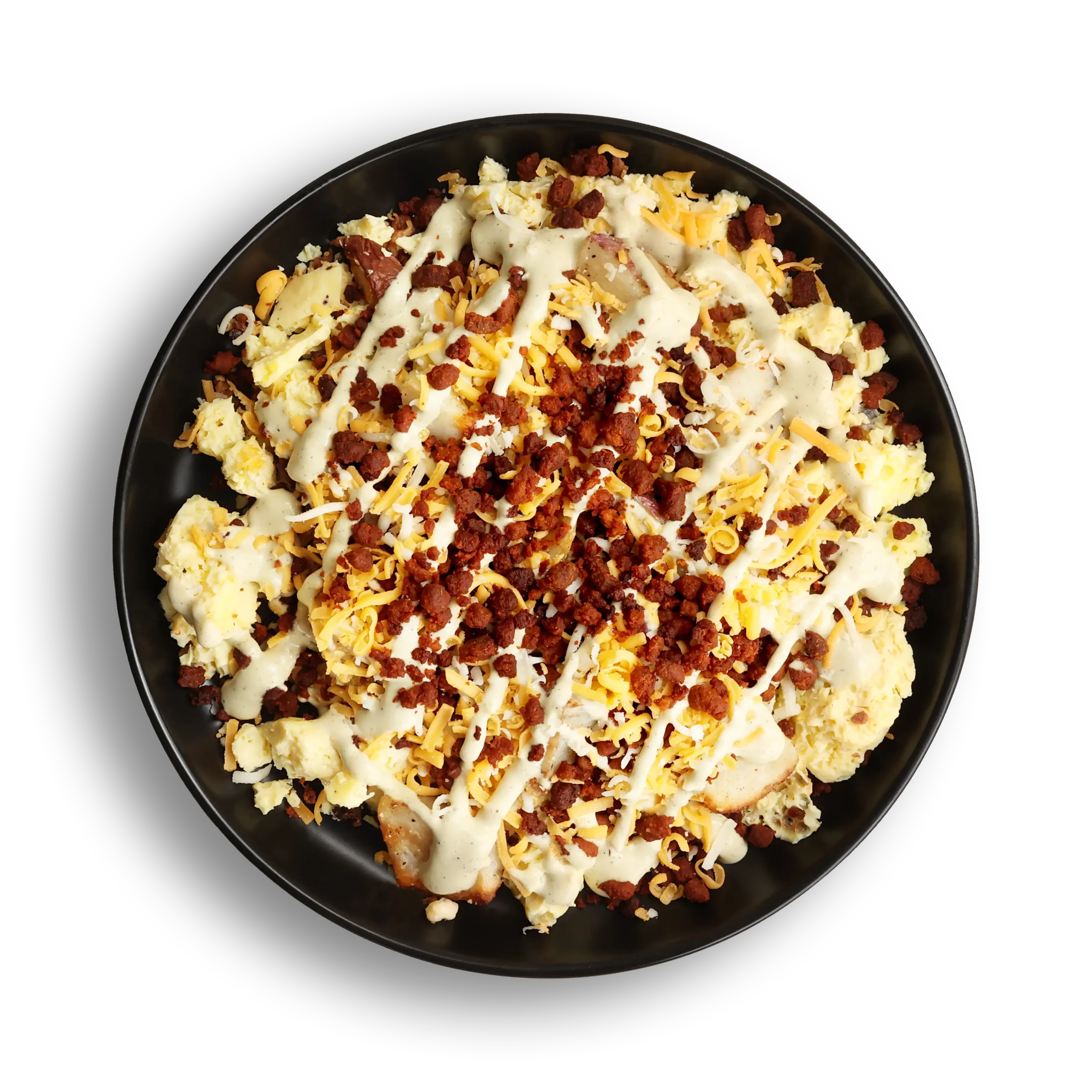 Eggs, red potatoes, chorizo crumbles (pork, water, spices, paprika, salt, dried vinegar, sugar, natural flavorings, dehydrated garlic, turmeric), cheddar, Monterey Jack (pasteurized milk, cheese cultures, salt, enzymes, annatto vegetable color), poblano ranch (soybean oil, water, poblano pepper, distilled vinegar, avocado, egg yolks, green jalapeño pepper, onions, garlic, lime juice concentrate, spice, salt, monosodium glutamate, xanthan gum, citric acid, ascorbic acid, sodium benzoate, potassium sorbate, propylene glycol alginate, calcium disodium EDTA), olive oil, pepper, and Italian seasoning.