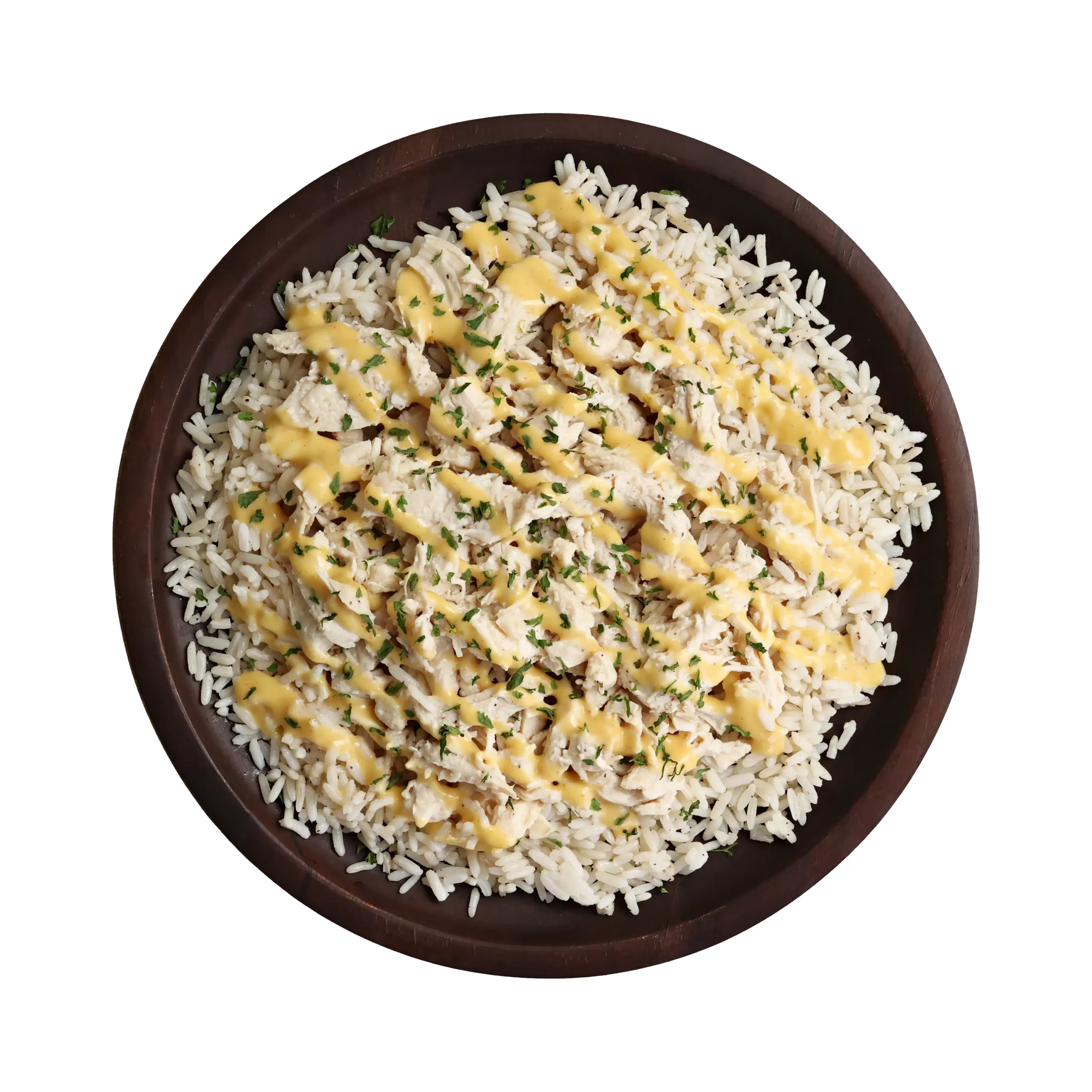 Chicken, rice (enriched long-grain parboiled rice, iron [ferric orthophosphate], niacin, thiamine [thiamine mononitrate], and folic acid), Dijon honey mustard (soybean oil, high-fructose corn syrup, distilled vinegar, water, Dijon mustard [distilled vinegar, water, mustard seed, honey, sugar, egg yolk, contains less than 2% of salt, mustard flour, xanthan gum, spice, oleoresin paprika (color), calcium disodium EDTA, yellow 5, corn syrup, natural flavor]), extra virgin olive oil, white wine vinegar, white cooking wine, black pepper, and salt.