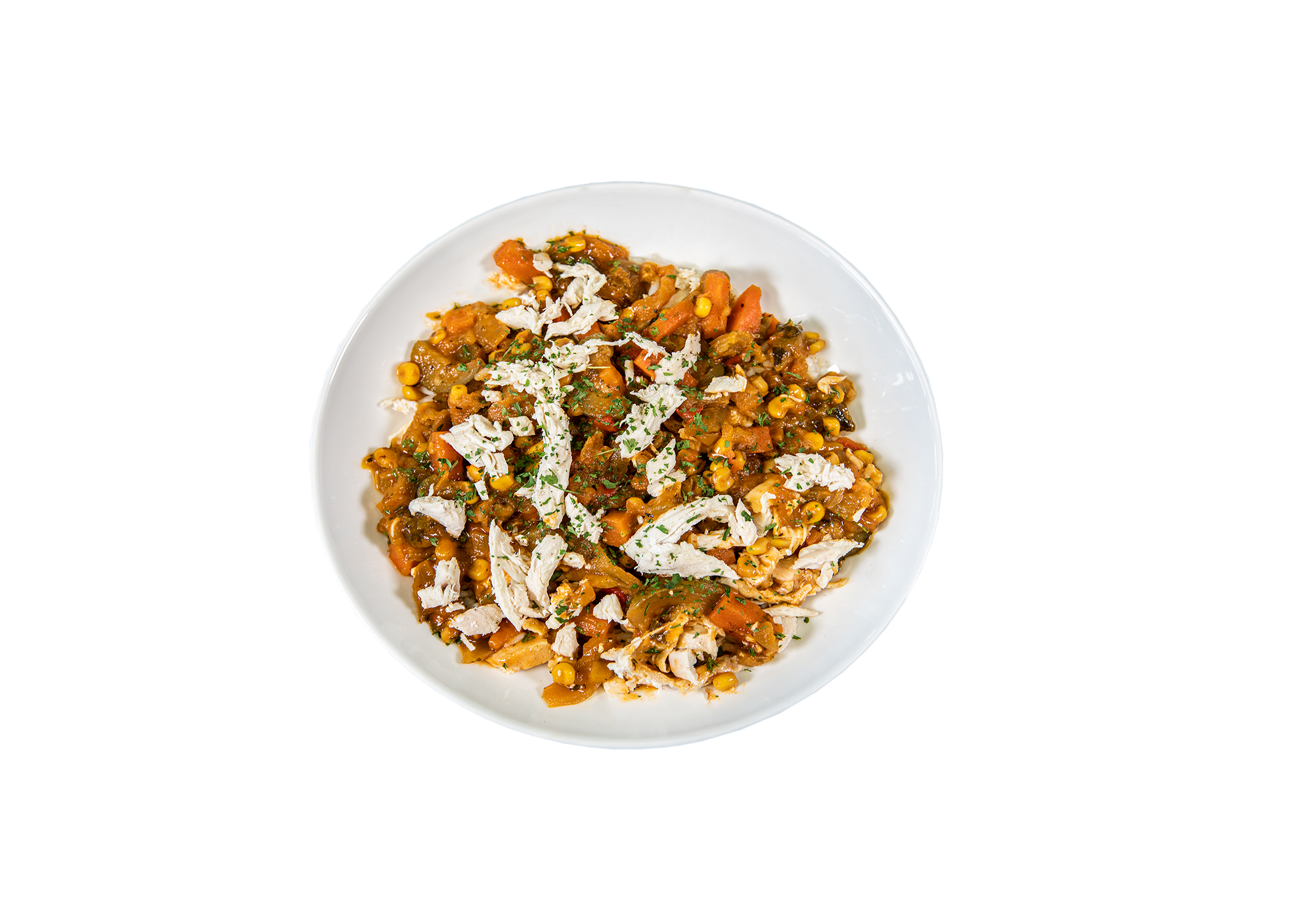 Chicken, vegetable soup (water, corn, onion, zucchini, green pepper, red pepper, yellow pepper, carrot, fire-roasted vegetable base [fire-roasted vegetables and concentrate (carrot, onion, tomatoes, and garlic), salt, yeast extract, sugar, celery, corn maltodextrin, cornstarch], diced tomatoes [tomatoes, tomato juice, citric acid], tomato paste, olive oil, garlic puree, gelatin, modified food starch, chipotle puree [dehydrated chipotle peppers, water, salt, white wine vinegar, citric acid, jalapeño peppers]), rice (enriched long-grain parboiled rice, iron [ferric orthophosphate], niacin, thiamine [thiamine mononitrate], and folic acid), parsley, olive oil, white cooking wine, white wine vinegar, salt, and pepper.