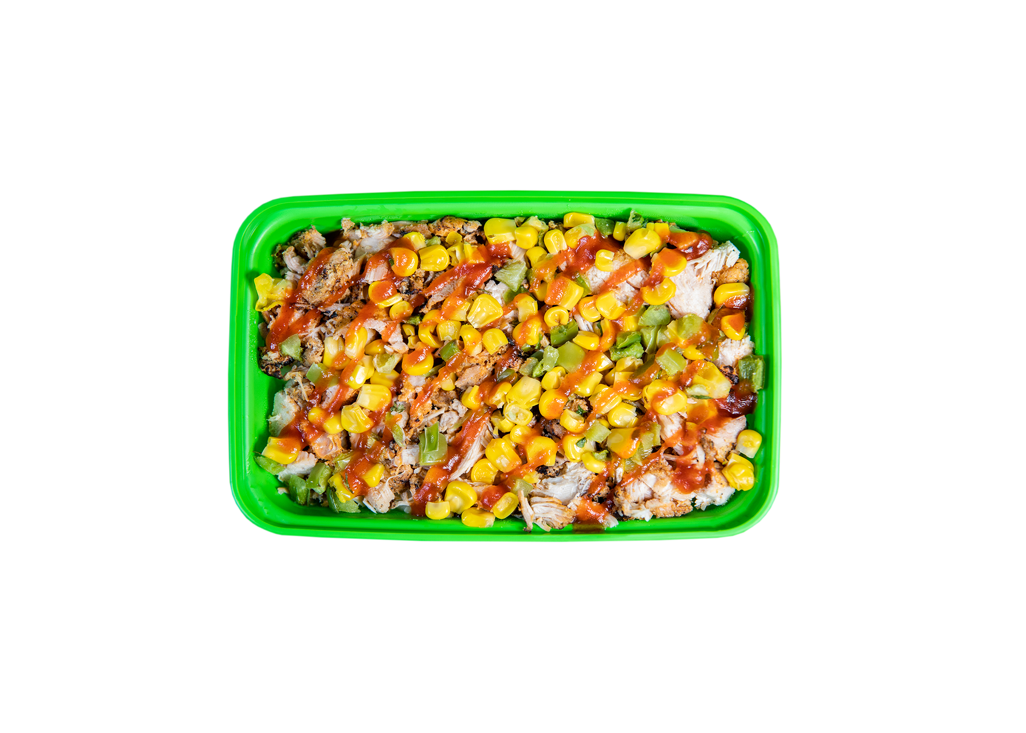 Garlic mashed potatoes (potatoes, water, cane sugar, cream cheese [pasteurized milk and cream, cheese culture, salt, locust bean gum], garlic powder, modified cellulose, onion powder, roasted garlic, salt, sodium acid pyrophosphate [added to maintain color], vegetable oil [soybean and/or canola oil], whey, whey protein concentrate, whole milk powder), chicken thigh, corn, green peppers, honey sriracha (sugar, water, red jalapeño pepper, honey, distilled vinegar, tomato paste, corn starch, salt, lime juice concentrate, acetic acid, natural flavors), garlic powder, salt, and pepper.