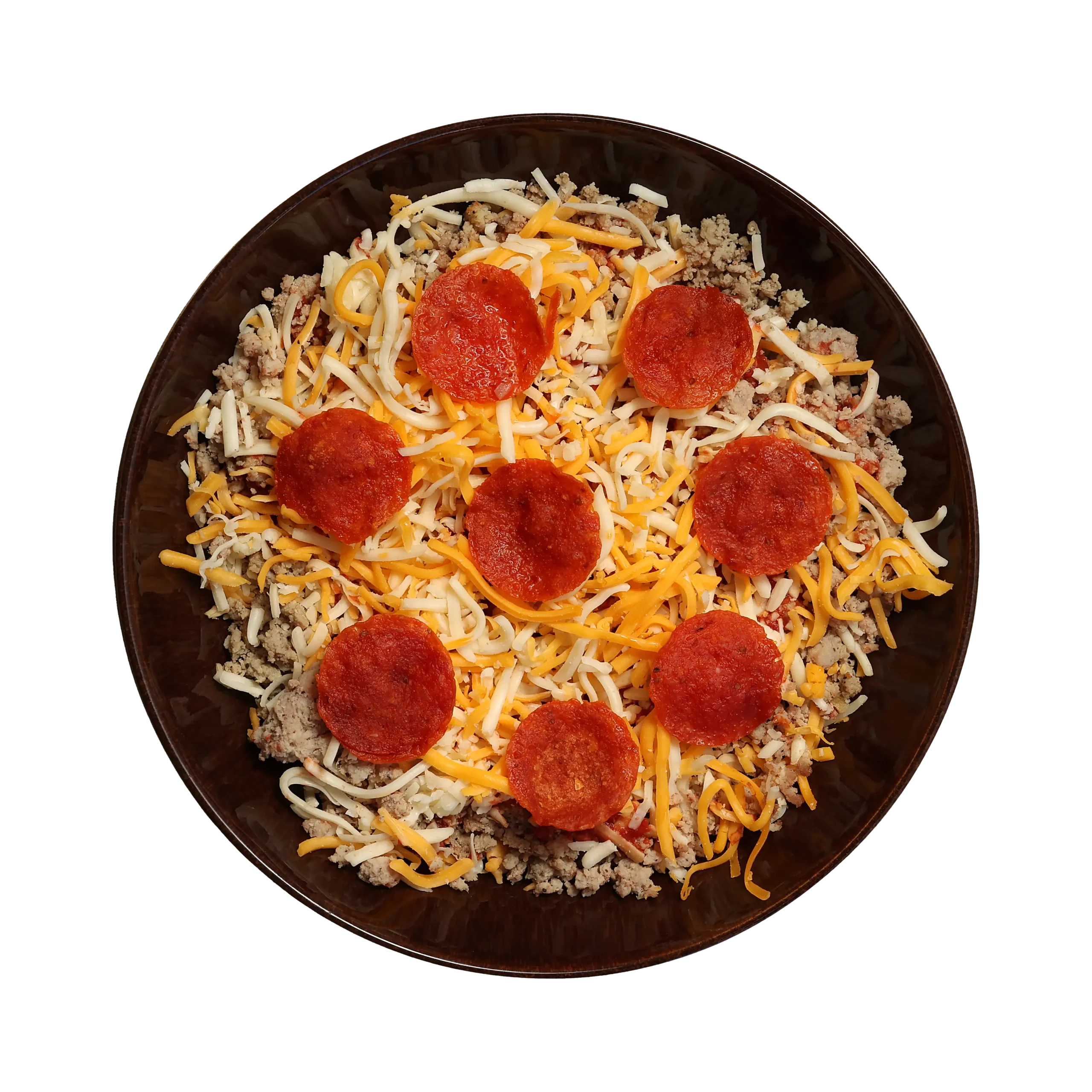 Ground turkey, basil tomato sauce (tomatoes, salt, dehydrated basil), cheddar, Monterey Jack (cheddar cheese [pasteurized milk, cheese cultures, salt, enzymes, annatto vegetable color]), pepperoni (pork and beef, salt, spices, dextrose, lactic acid starter culture, oleoresin of paprika, flavoring, sodium nitrite, BHA, BHT, citric acid), olive oil, white cooking wine, fajita seasoning, Italian seasoning, salt, and pepper.