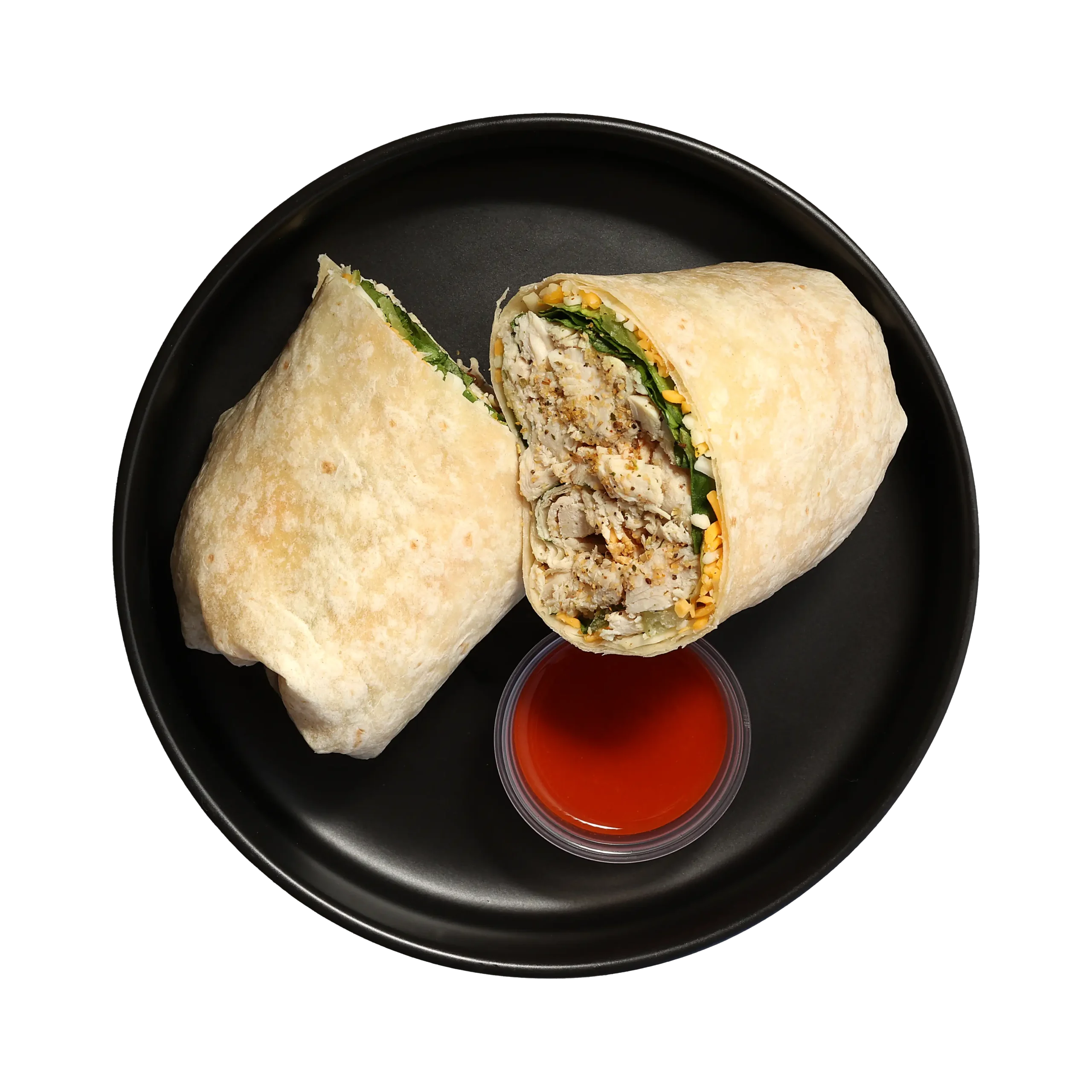 Chicken, tortilla (enriched unbleached flour [wheat flour, niacin, reduced iron, thiamine mononitrate, riboflavin, and folic acid], water, vegetable shortening [palm oil, corn oil], salt, aluminum-free leavening [sodium acid pyrophosphate, sodium bicarbonate, corn starch, monocalcium phosphate], wheat protein, calcium propionate, sorbic acid, dough conditioner [fumaric acid, xanthan gum, mono- and diglycerides, sodium metabisulfite]), cheddar cheese, Monterey Jack cheese (pasteurized milk, cheese cultures, salt, and enzymes), corn starch (anti-caking agent), tomatoes, romaine lettuce, buffalo sauce (distilled vinegar, aged cayenne red peppers, salt, water, modified corn starch, canola oil, paprika, xanthan gum, carrot fiber, garlic powder, and natural flavor), olive oil, white cooking wine, white wine vinegar, and Montreal seasoning.