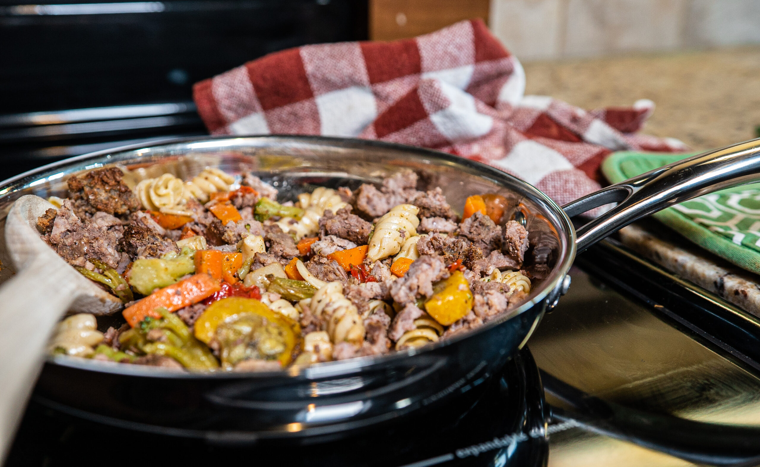Lean ground beef, pasta (wheat semolina, niacin, riboflavin, folic acid, maltodextrin, natural flavors, potato starch, sea salt, spices, sugar, yeast extract), broccoli, carrots, yellow squash, red bell pepper, zucchini, BBQ sauce (distilled vinegar, tomato paste, modified corn starch, salt, pineapple juice concentrate, natural smoke flavor, spices, caramel color, molasses, sodium benzoate, garlic, mustard flour, corn syrup, sugar, tamarind, natural flavor, and celery seed).