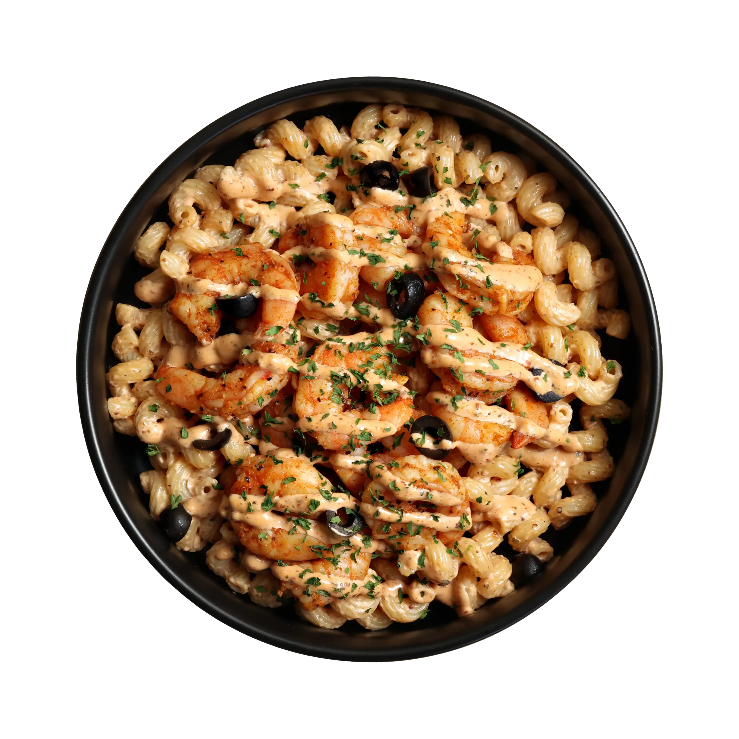 Pasta (water, whole wheat durum flour, enriched durum semolina and durum wheat flour [durum wheat flour, niacin, ferrous sulfate, thiamine mononitrate, riboflavin, folic acid]), shrimp, remoulade sauce (soybean oil, water, distilled vinegar, onion, egg yolk, sugar, salt, tomato paste, mustard seed, garlic purée [garlic, water], lemon juice concentrate, xanthan gum, paprika, onion juice powder, natural flavor, dried green onion, maltodextrin, mustard oil), olives, parsley, lemon pepper, and olive oil.