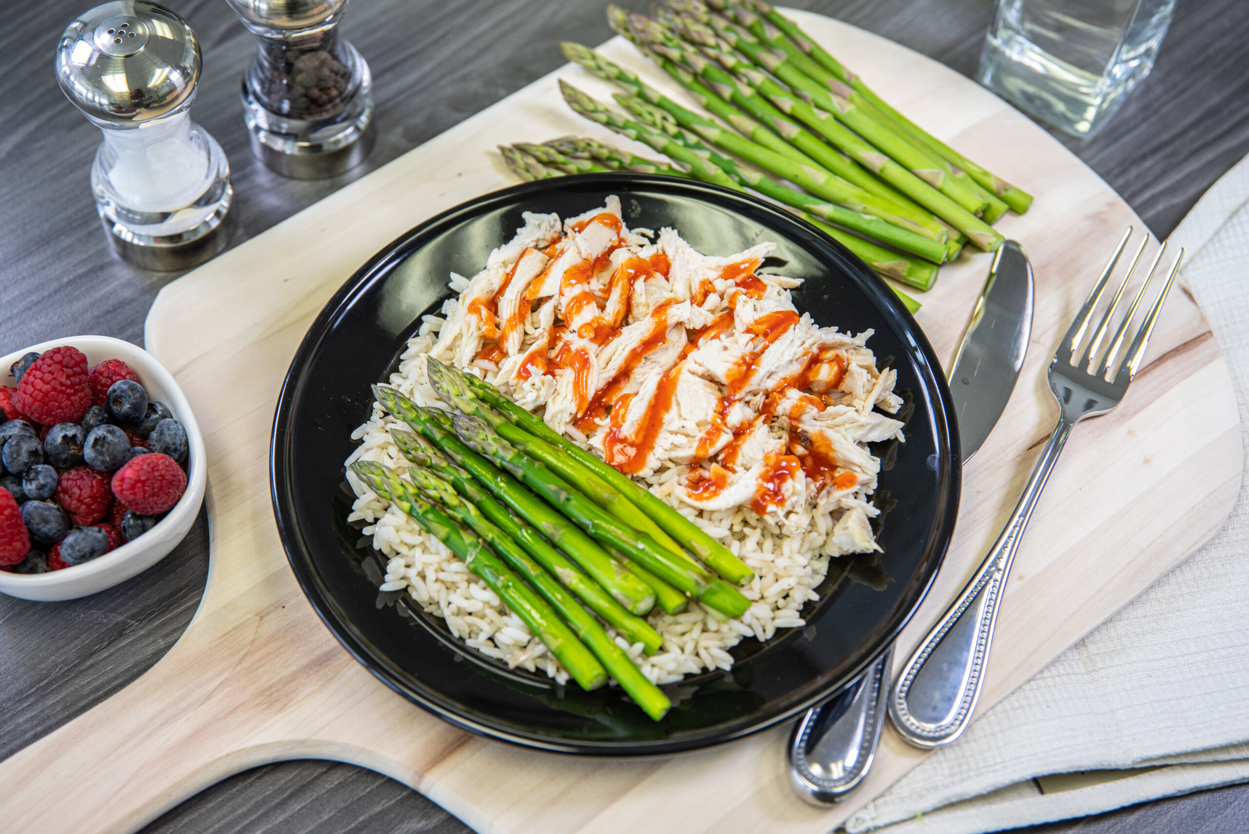 Chicken, rice (enriched long grain parboiled rice, iron [ferric orthophosphate], niacin, thiamine [thiamine mononitrate], and folic acid), honey sriracha (sugar, water, red jalapeño pepper, honey, distilled vinegar, tomato paste, corn starch, salt, lime juice concentrate, acetic acid, natural flavors), asparagus, olive oil, white wine vinegar, white cooking wine, lemon pepper, parsley, salt, and pepper.