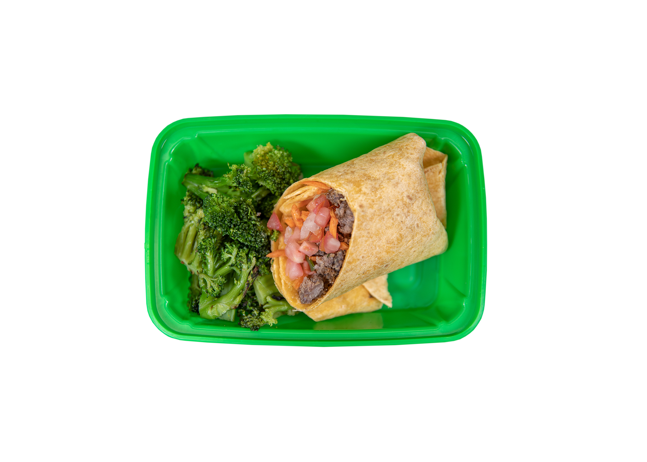 Lean ground beef, cheddar jalapeño wrap (enriched unbleached flour [wheat flour, niacin, reduced iron, thiamine mononitrate, riboflavin, and folic acid], water, vegetable shortening, palm oil, olive oil, salt, dextrose, dehydrated garlic, onion, jalapeño, natural flavor, green bell pepper, yeast extract, citric acid, disodium inosinate, disodium guanylate, artificial flavors, silicon dioxide, salt, sodium acid pyrophosphate, sodium bicarbonate, cornstarch, monocalcium phosphate, wheat protein), pico de gallo (tomato, yellow onion, green pepper, red pepper, jalapeño pepper, cilantro, olive oil, vinegar, salt, black pepper), broccoli, shredded carrots, sweet chili Thai sauce (sugar, water, pickled red chili, vinegar, garlic, salt, xanthan gum), olive oil, white cooking wine, fajita seasoning, garlic salt, black pepper, and salt.