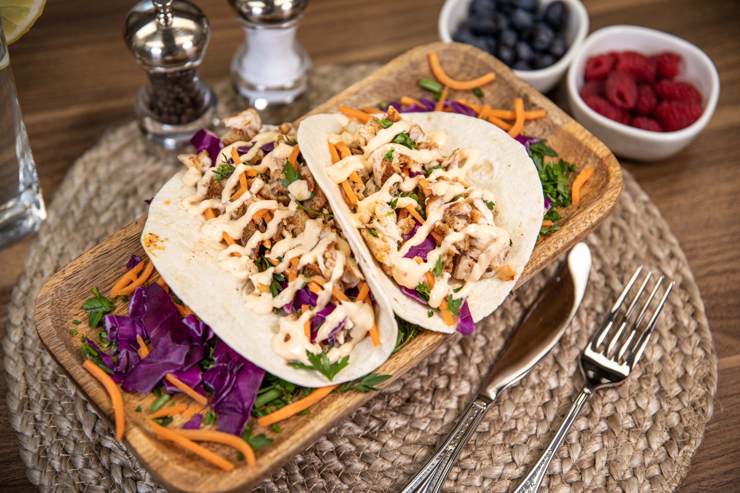 Tilapia, tortilla (enriched unbleached flour [wheat flour, niacin, reduced iron, thiamine mononitrate, riboflavin, folic acid], water, vegetable shortening [palm oil, olive oil], salt, aluminum-free leavening, wheat protein), chipotle spread (soybean oil, egg yolks, distilled white vinegar, salt, high fructose corn syrup, sugar, spices, mustard flour, red bell peppers, xanthan gum, onion powder, calcium disodium, paprika), red cabbage, carrots, parsley, cumin, paprika, garlic salt, and pepper.