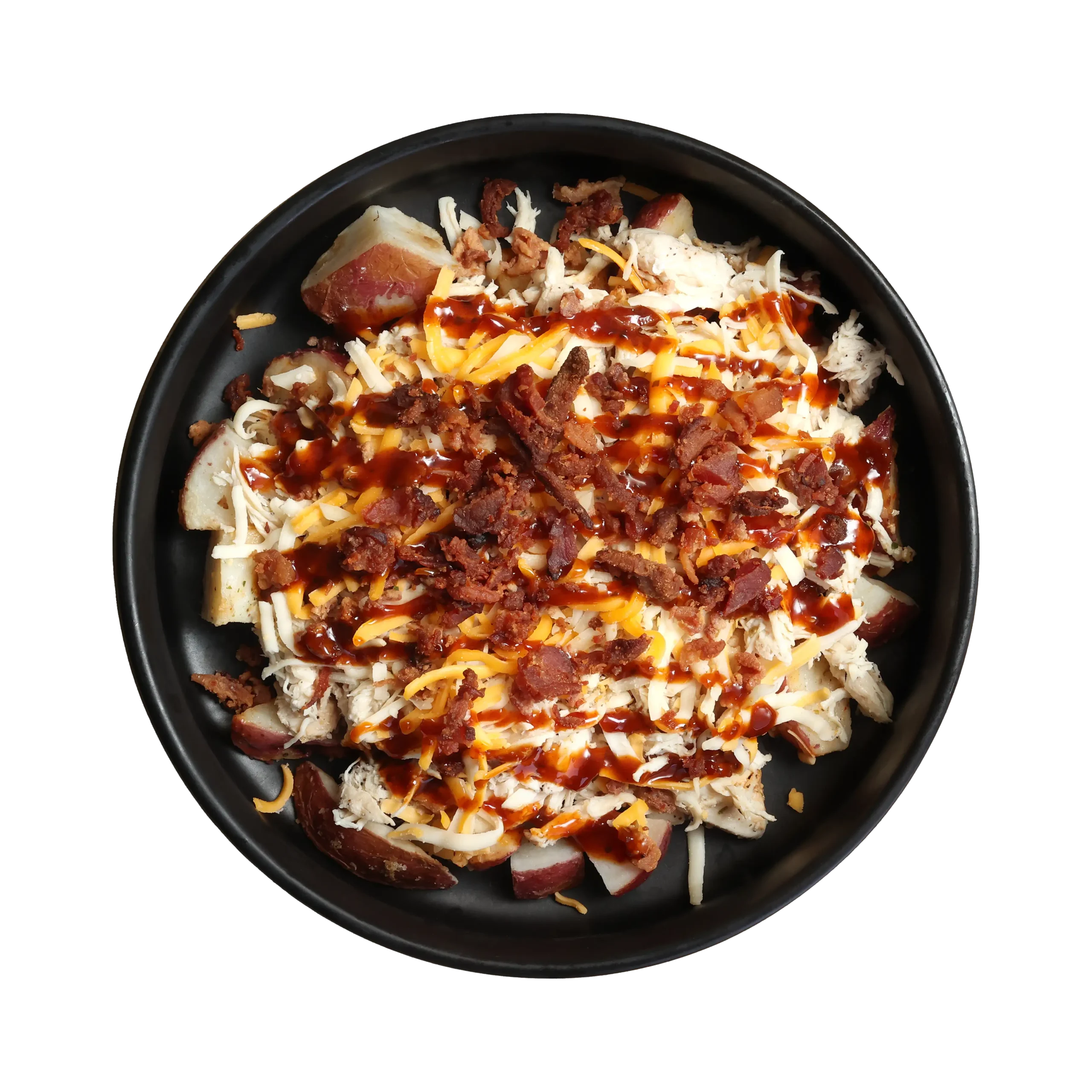 Chicken, red potatoes, cheddar, Monterey Jack, bacon (water, salt, sodium nitrite, sugar, brown sugar, smoke flavoring, sodium phosphates, sodium erythorbate, sodium ascorbate, apple flavor), Korean BBQ sauce (sugar, distilled vinegar, soy sauce [contains wheat], gochujang hot pepper paste, water, brown sugar, chili garlic sauce), Montreal seasoning, Italian seasoning, olive oil, white wine, white wine vinegar, black pepper, and salt.
